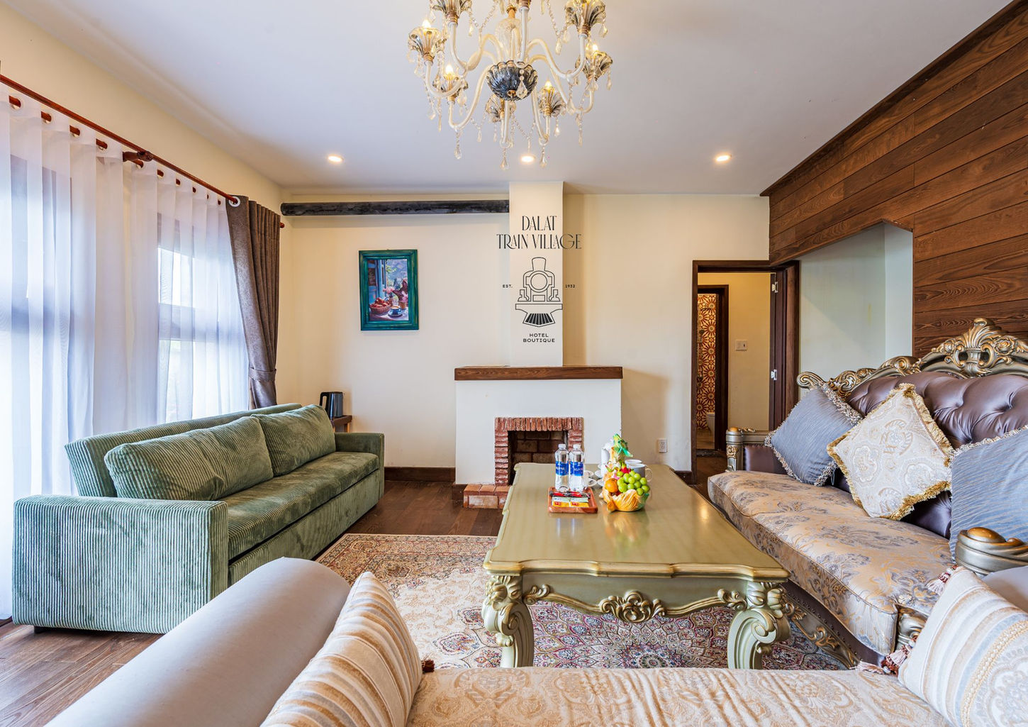 The Family Two Bedroom offers two separate bedrooms within a heritage villa, ensuring comfort and privacy for families or small groups. Soft daylight filters through French-style windows, complementing the original stone-and-wood textures. Overlooking pine gardens and the historic railway compound, the space invites warm bonding moments and a peaceful Dalat retreat.